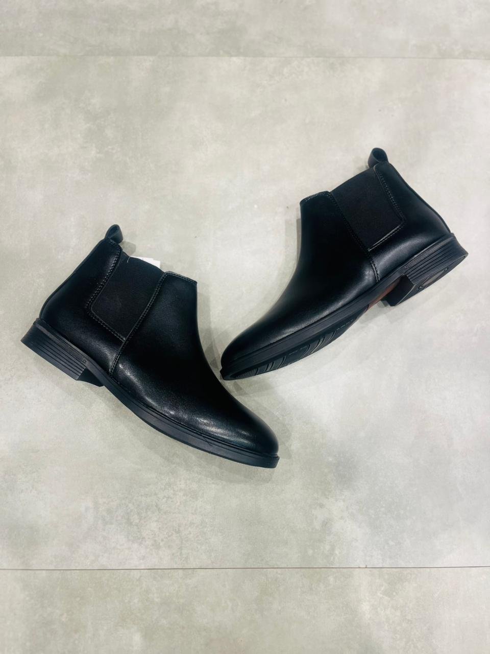 Classic black Chelsea boots with a smooth leather-finish upper, elastic side panels, and easy slip-on fit. Durable sole ensures comfort for daily and formal wear.