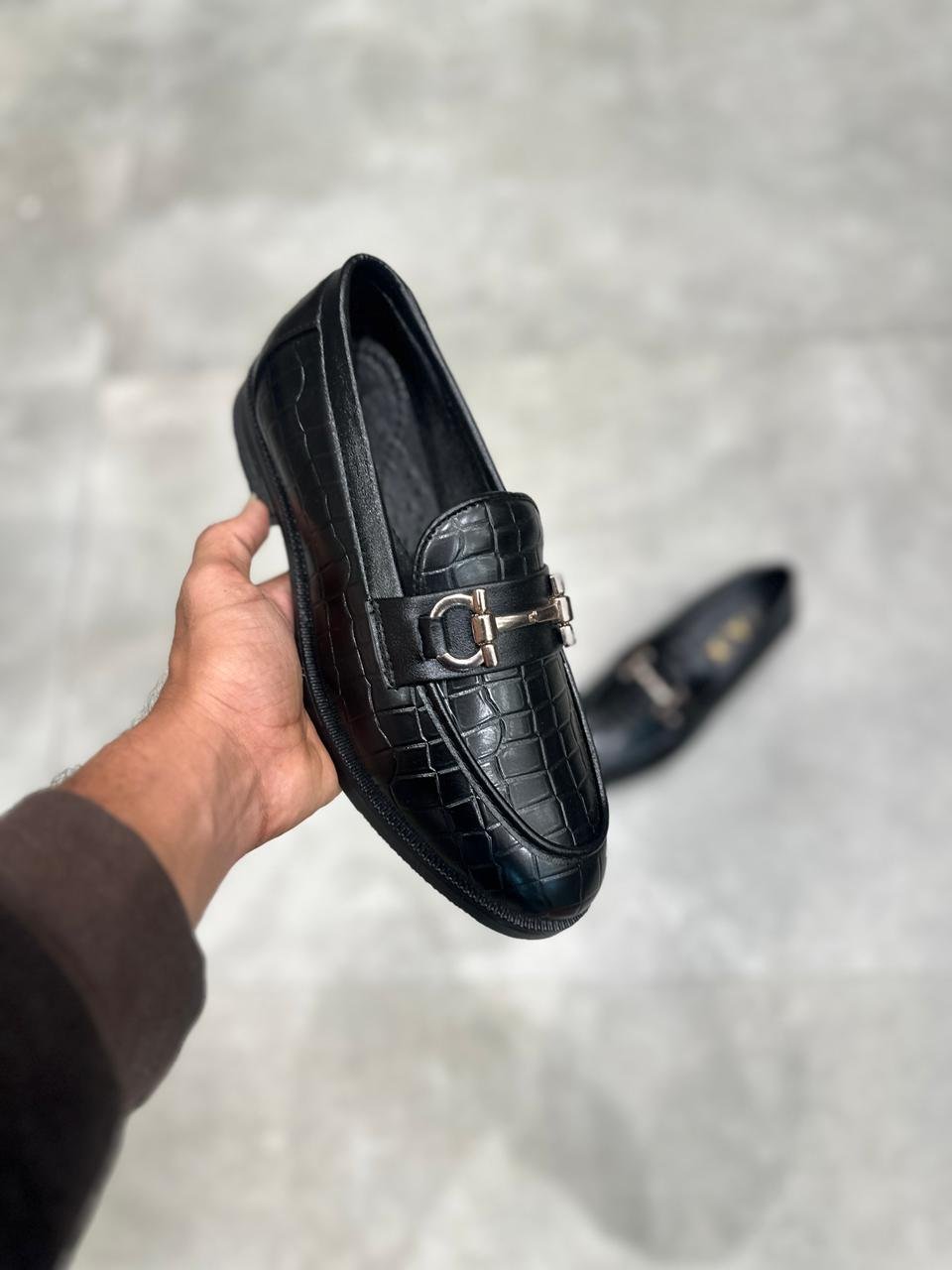 Premium croc-textured leather loafers with elegant metal bit, slip-on comfort, durable sole, perfect for office, business, and formal occasions.